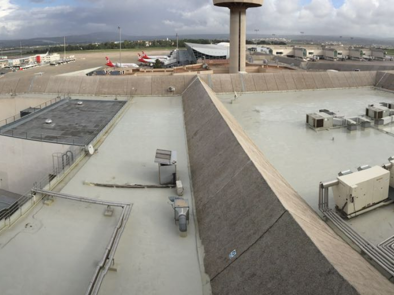 On this roof, water leakage and ponding issues were resolved through a complete renewal of the waterproofing system. The 139 skylights were raised to ensure maintenance staff safety, and the slopes were reconfigured using cellular concrete and R4 mortar. Finally, the SikaRoof Pro+ system was applied with a reflective white finish and technical walkways for safe and durable access.