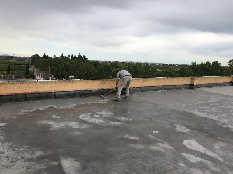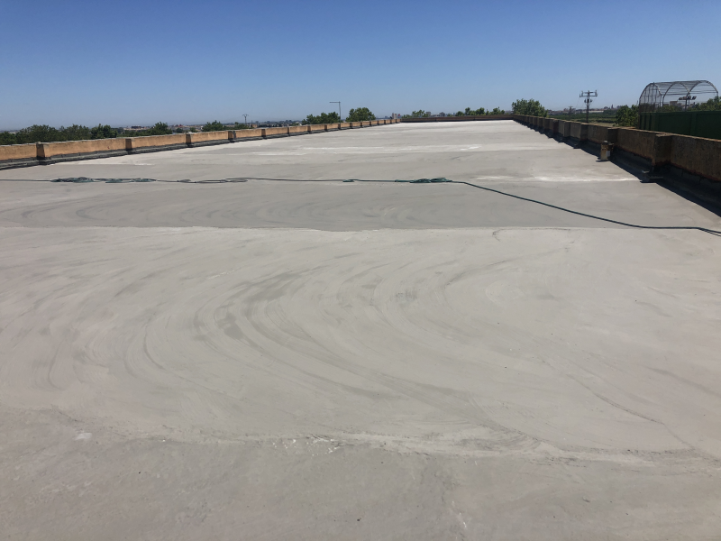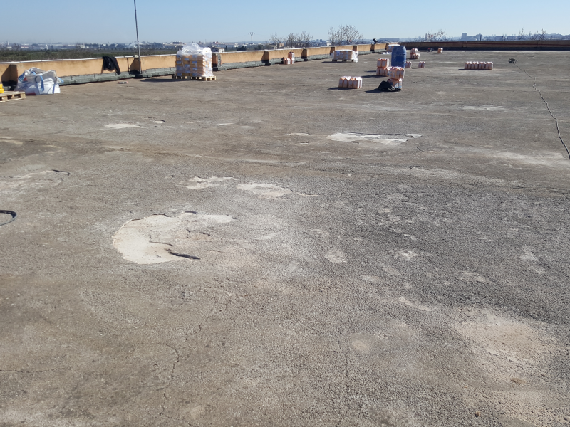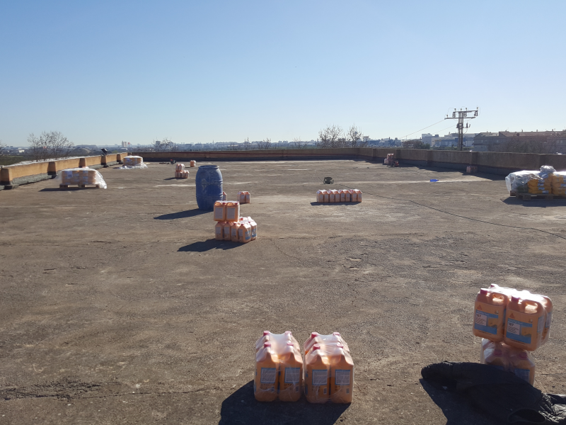 We started by leveling and fixing the surface before applying several layers of plural component waterproofing mortar. Around the gutters we did sealings and reinforced membrane waterproofing and in the 340 m of structural joints whe treated them with polyurea membrane.