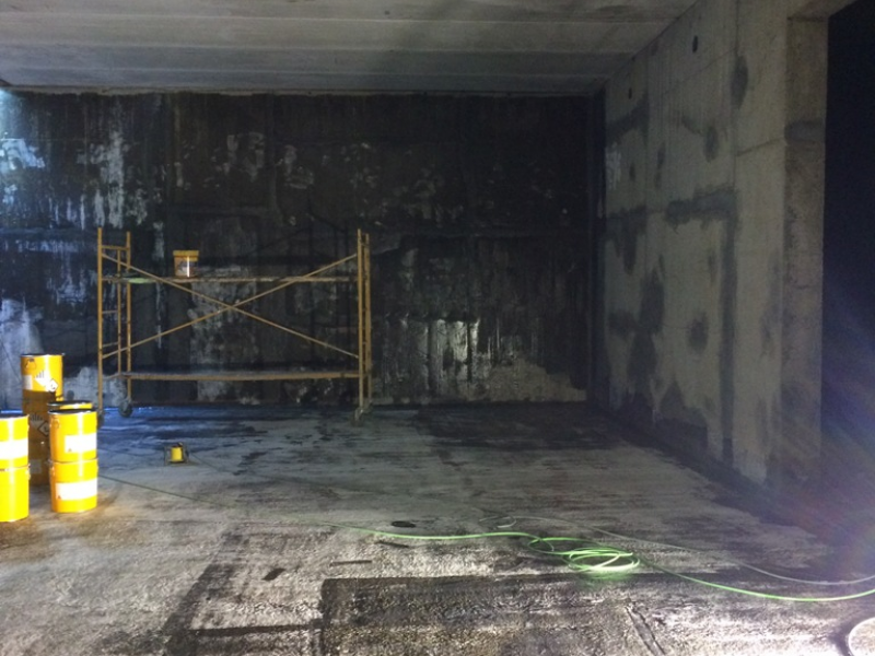 Para ello se construyó un aljibe subterráneo de hormigón encofrado que, tras regularización de paramentos, se impermeabilizó con poliurea proyectada en caliente para garantizar la estanqueidad 100% de las instalaciones contra incendios.
