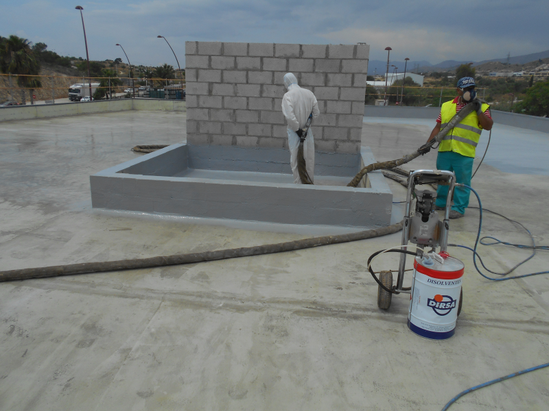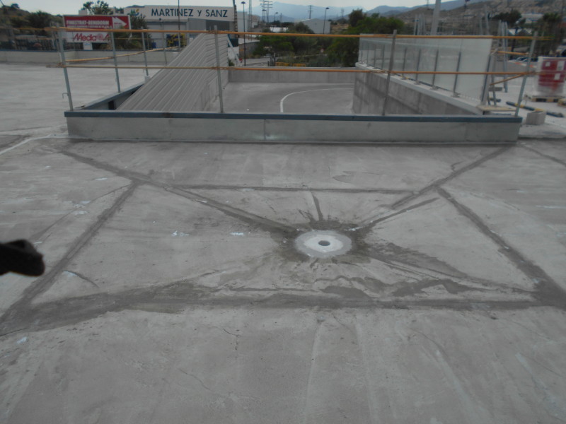 En el proyecto de una nueva parte de esta zona comercial se optó por una impermeabilización con membrana de poliuretano proyectada en caliente y totalmente adherida a soporte en toda la extensión de la cubierta parking.