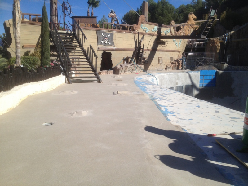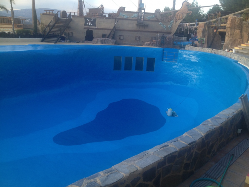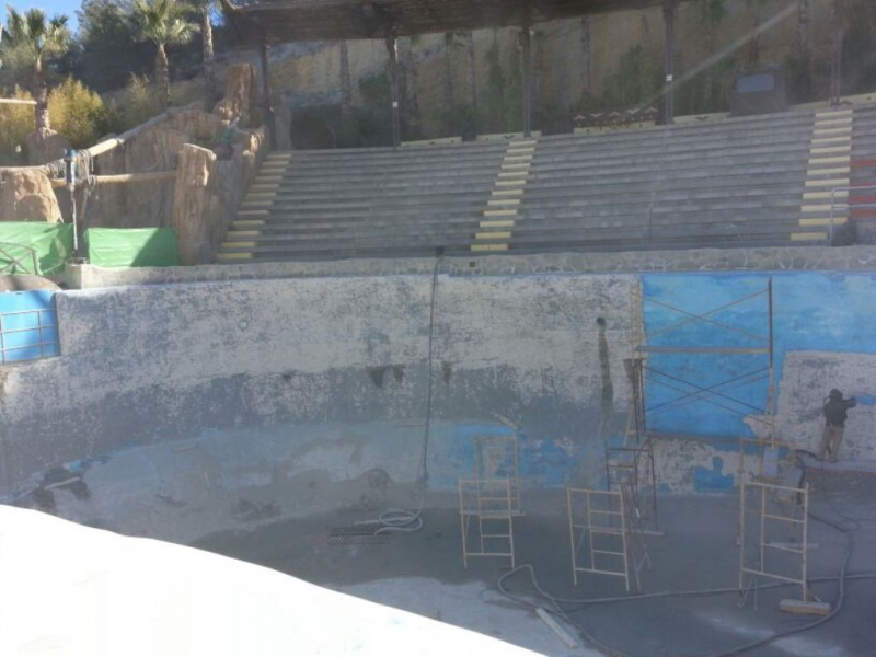 Impermeabilización realizada en el vaso de la piscina principal del delfinario de Mundomar en Benidorm. La primera labor fue la de realizar un chorro de árido completo para pelar toda la pintura existente en el soporte. Al tratarse de una vaso gunitado directamente sobre la montaña la impermeabilización la realizamos con un mortero impermeable de dos componentes y lo acabamos pintando con un revestimiento acrílico apto para el contacto con los animales. En la playa de la piscina, realizamos una capa de rodadura con un poliuretano autonivelante saturado de árido que ayuda a los entrenadores y cuidadores a no resbalar a pesar del pavimento húmedo.
