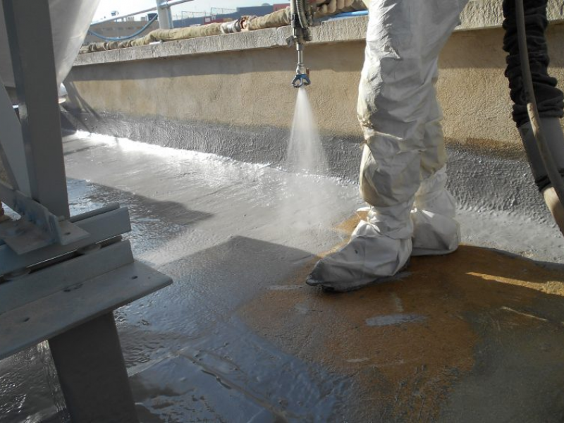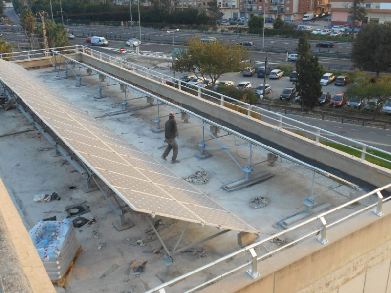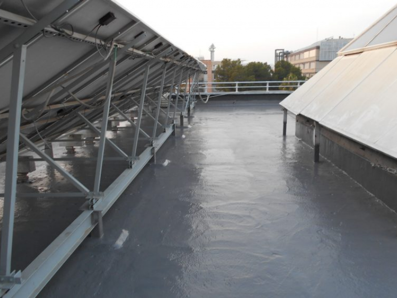 La obra consistía en levantar el suelo y demoler los sistemas de impermeabilización antiguos, una capa de PVC de una primera reparación y la impermeabilización original de tela asfáltica, para a continuación realizar una impermeabilización de membrana de poliuretano proyectada en caliente. Finalmente se volvía a reponer el suelo original. Hubo que tener en cuenta que se trataba de cubiertas con instalaciones solares cuya estructura se encontraba anclada al suelo.