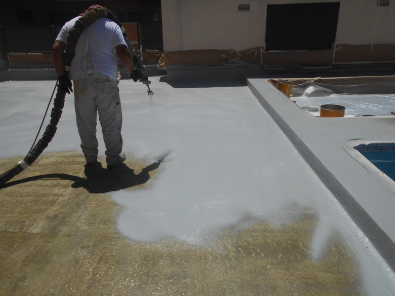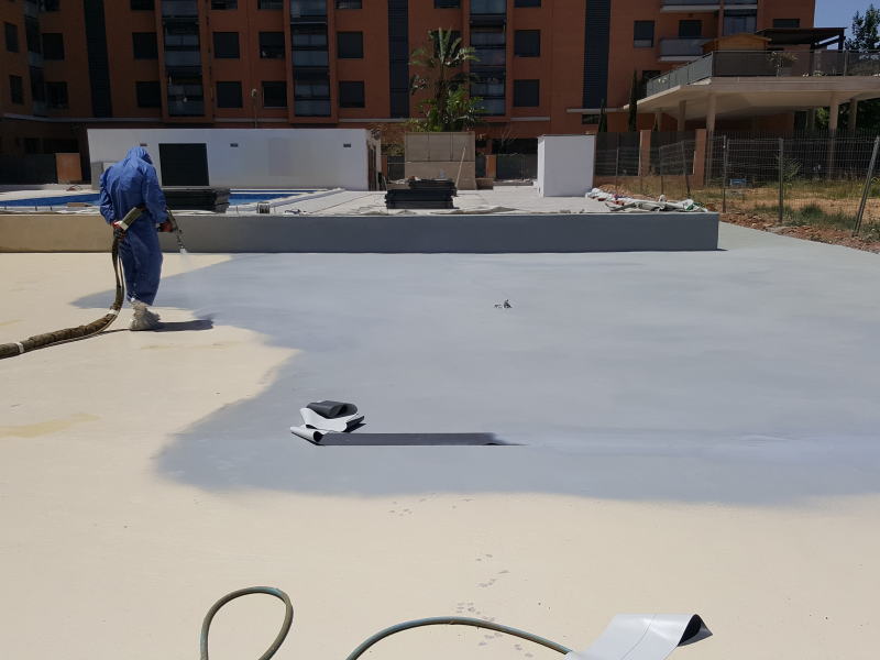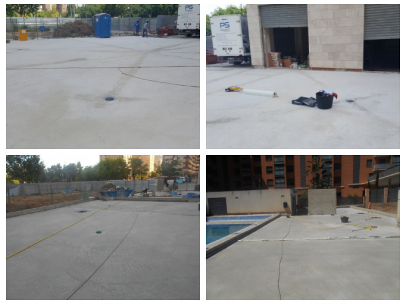 Las zonas comúnes, el parque infantil, jardín y piscinas comunitarias se encontraban en la cubierta parking y presentaban numerosas filtraciones por lo que se decidió actuar de forma integral reparando toda la superficie llegando al forjado, tratando juntas y confeccionando de nuevo pendientes, y tras realizar una impermeabilización con memrbana de poliuretano bicomponente Sikalastic 851R se volvió a construir de nuevo todo sobre la misma.